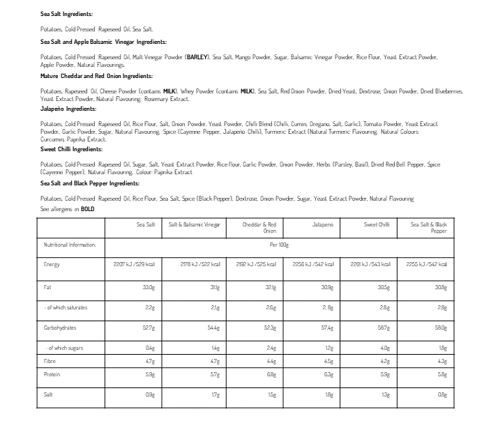 Variety box containing: 6 x Sea Salt, 6 x Mature Cheddar and Red Onion, 6 x Sea Salt and Apple Balsamic Vinegar, 2 x Jalapeno, 2 x Sweet Chilli, 2 x Sea Salt and Black Pepper.
