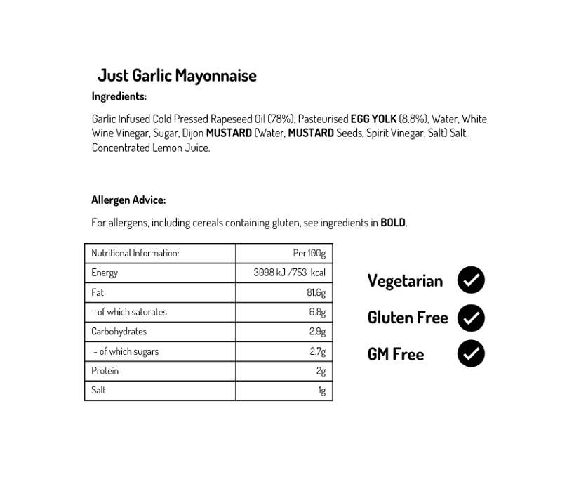 Add a burst of flavour to all your favourite dishes with Just Garlic mayonnaise, the perfect balance of zesty garlic taste and velvety smooth texture. Use it for making a delightful potato salad or as the perfect partnership with fish. Without forgetting to drizzle some garlic mayonnaise over your salads or add some to your sandwiches for a burst of garlic infused deliciousness!