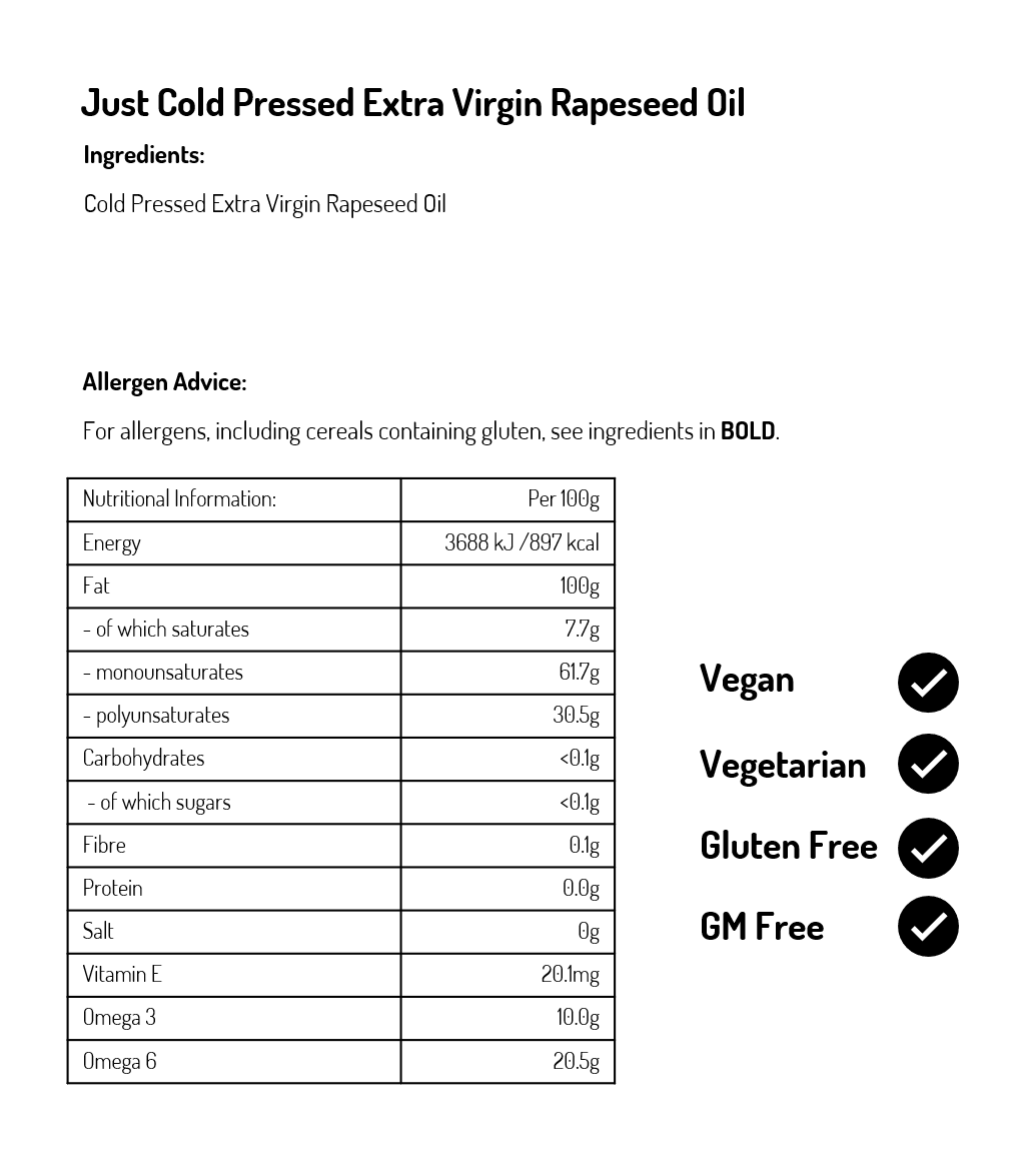 Produced by the Froggatt family in Staffordshire. Our rapeseed oil is grown, harvested, stored, cold pressed, filtered and bottled on our farm, giving our oil 100% traceability and therefore helps us to keep down our food miles. To see our environmentally friendly farm at work, and how this oil was made, watch our short video - What makes Just Oil unique - YouTube
