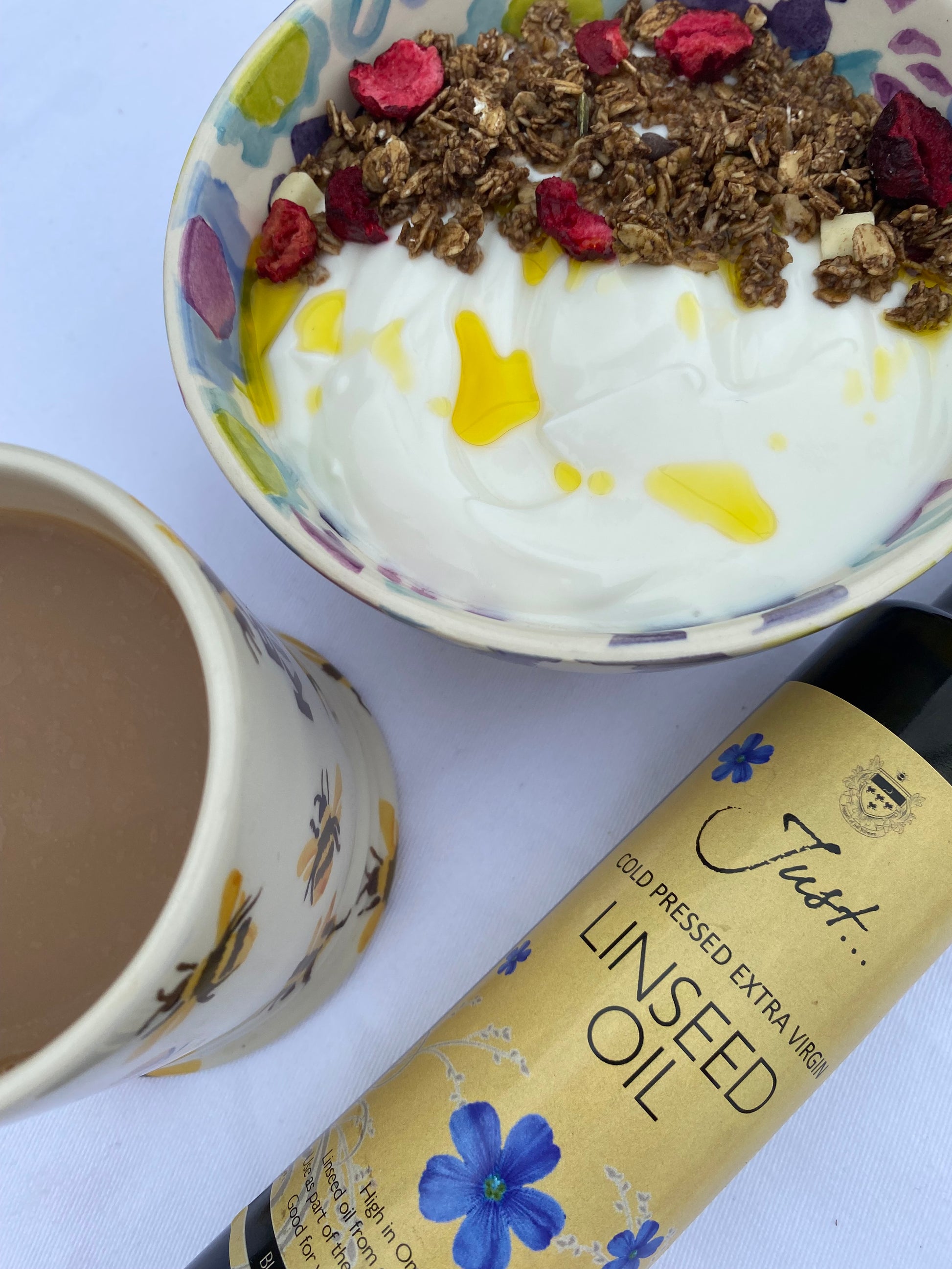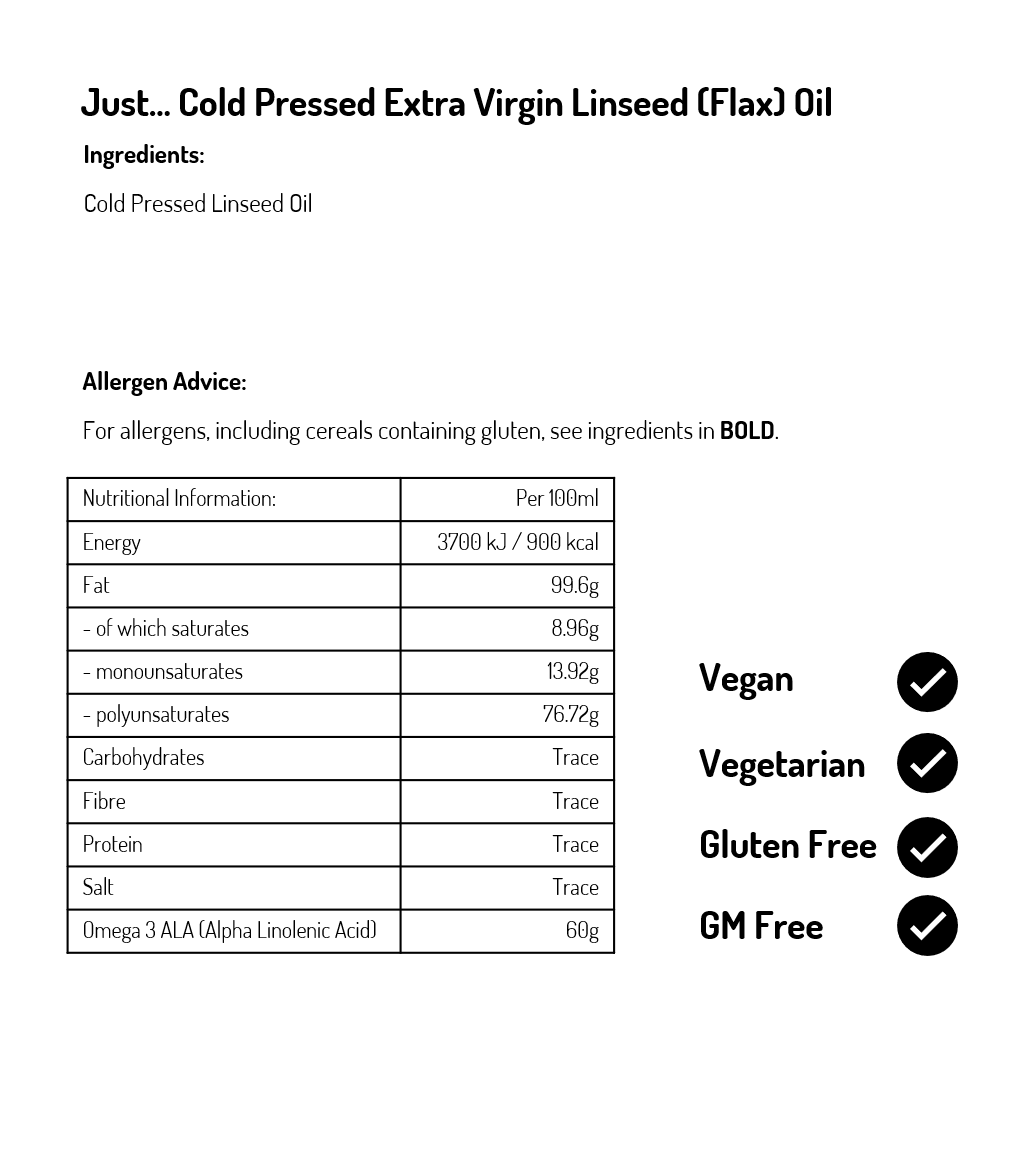 - 5ml every day in your diet, from adding to breakfast yoghurt, smoothies, to soups and salad dressings or low temperature baked cakes