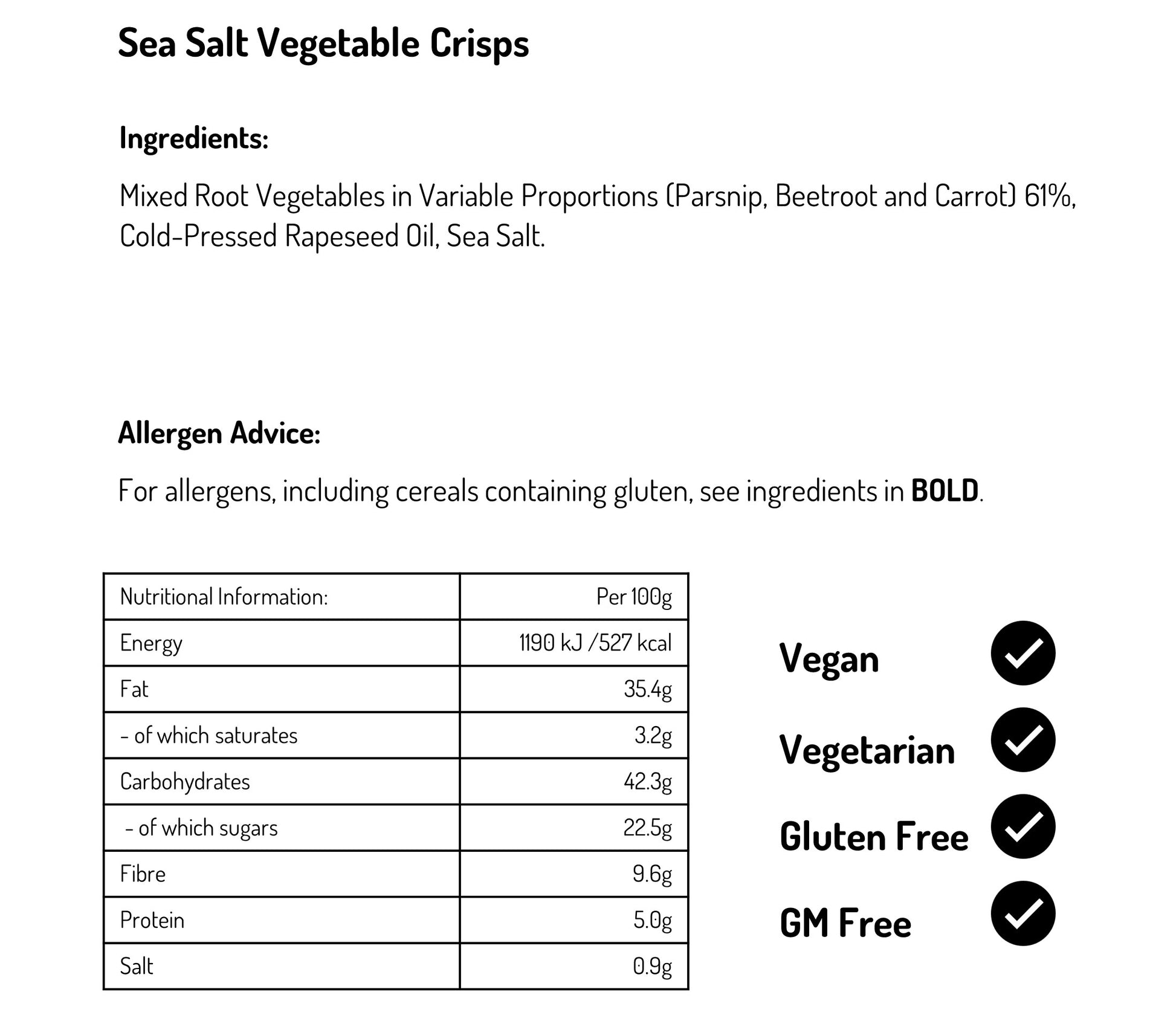 Lightly salted vegetable crisps. Beetroot, Carrots and Parsnips cooked in our cold-pressed rapeseed oil.