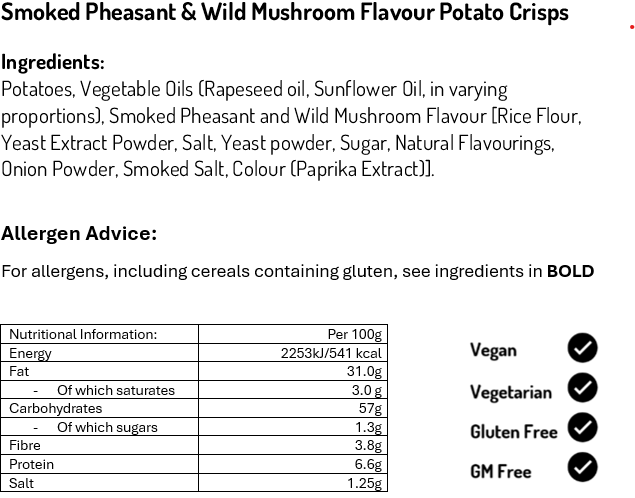 Pheasant tastes of a rich buttery flavoured corn-fed chicken and we have seasoned these crisps with smoked salt, and a wonderfully savoury earthy meaty flavour of wild mushroom.